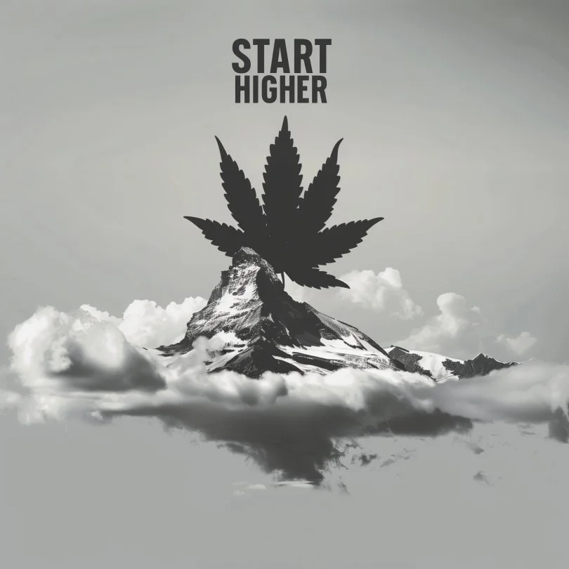 A mountain with a large upside-down marijuana leaf on top, with the text 'START HIGHER' above it.